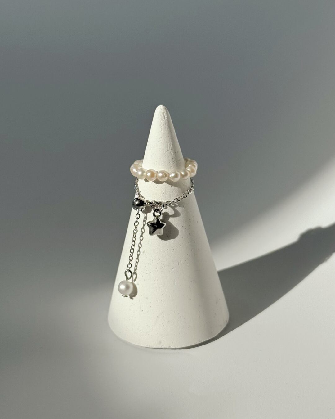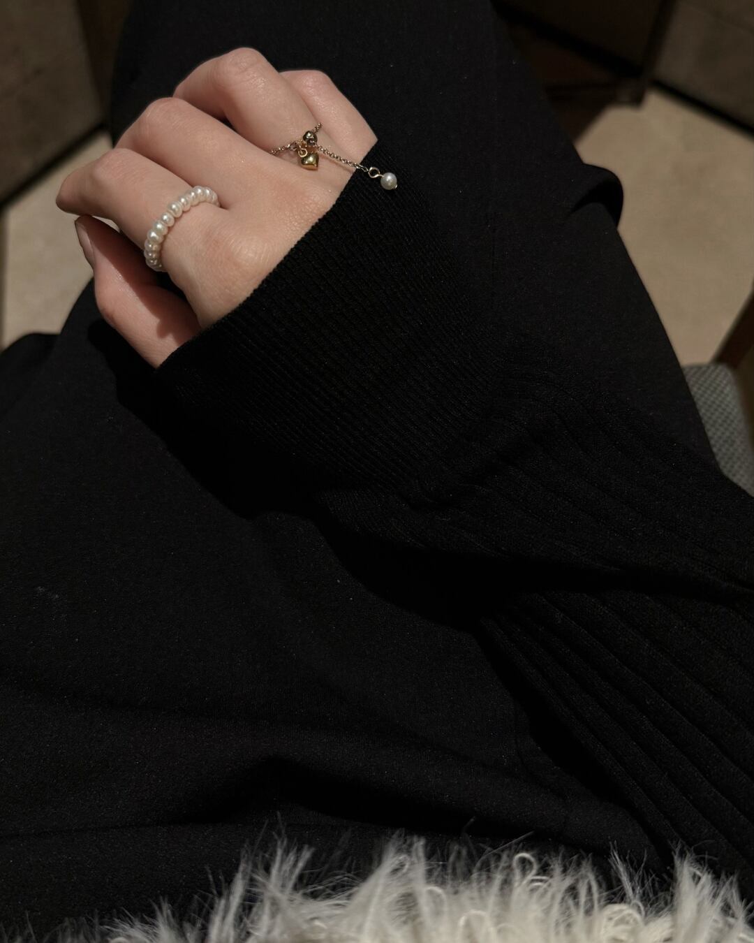 手元の動きに合わせてパールがさりげなく揺れ、シンプルな中にも柔らかな表情を添えてくれます